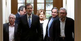 El Presidente del Gobierno, Mariano Rajoy, y la Ministra de Empleo y Seguridad Social, Fátima Báñez, se han reunido esta mañana en el Palacio de la Moncloa con los presidentes de la CEOE, Juan Rosell, CEPYME, Jesús Terciado, y los secretarios generales de CCOO, Ignacio Fernández Toxo, y UGT, Cándido Méndez.